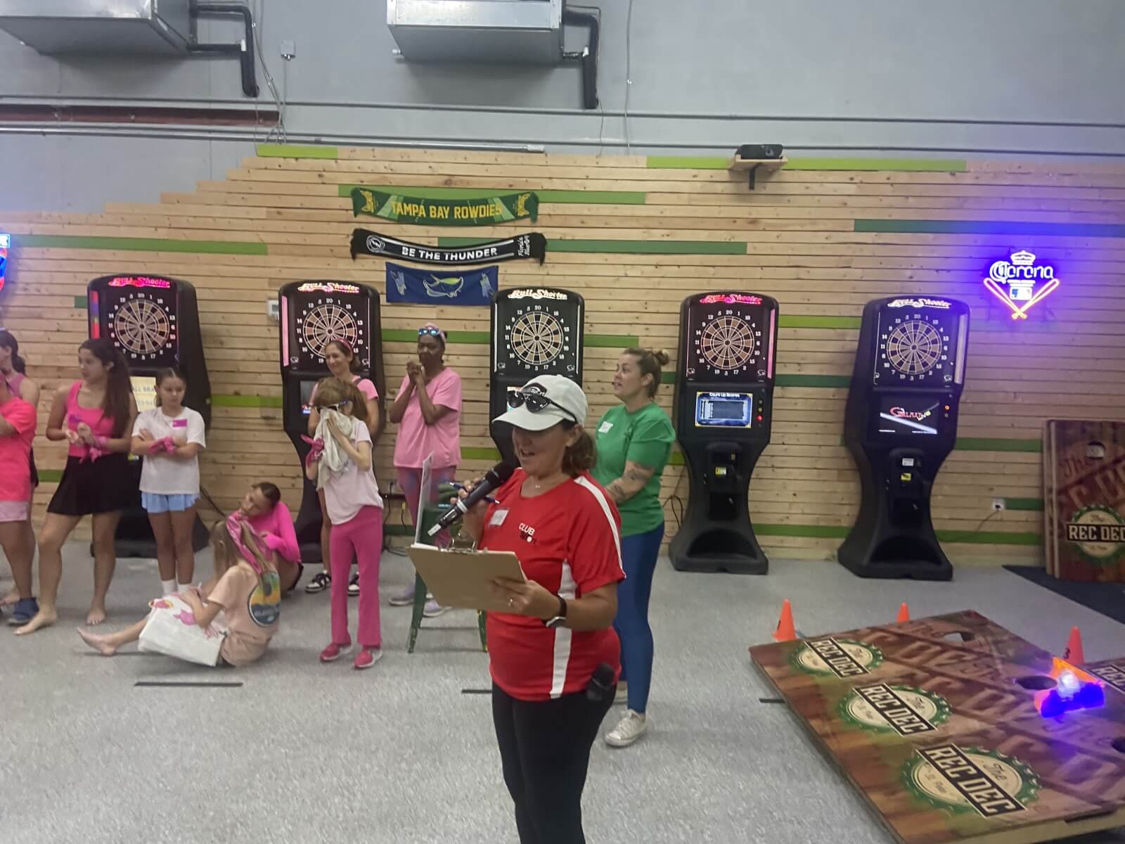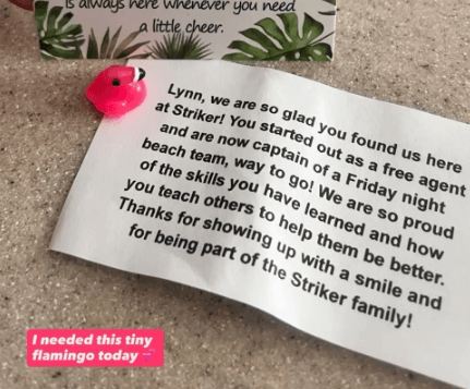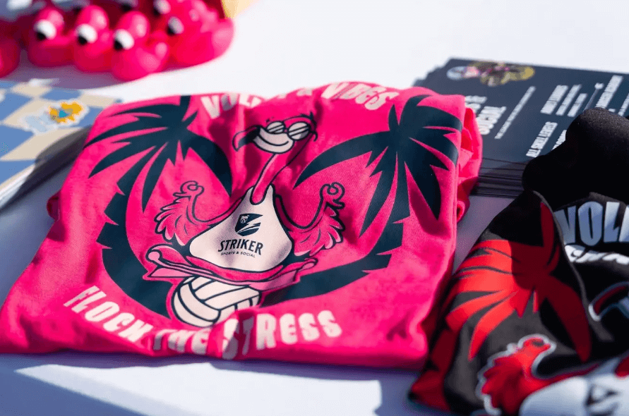 Each player received an individualized affirmation card at check-in, positive-message volleyballs, and uplifting stickers. A dedicated “Flock the Stress” zone offered space for reflection, stretching, and access to mental health resource information. Throughout the day, we passed out flamingo duckies with inspiring messages hidden underneath, small moments of joy that sparked connection and human connection.